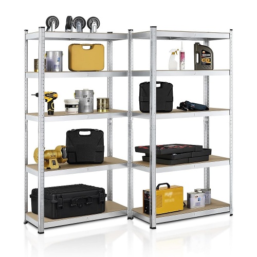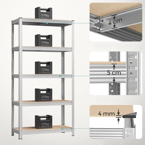 The steel frame and the shelves made of wood material offer a strong hold. The reinforcements on the legs and the crossbars under each shelf level increase the stability. The galvanised frame is rust resistant. Each shelf holds weights up to 175 kg. The distance between the individual shelves is flexibly adjustable. You can also use the shelf in two parts. The enclosed tilt protection promises safe use. The shelf is suitable for cellars, laundry rooms, workshops and business premises.